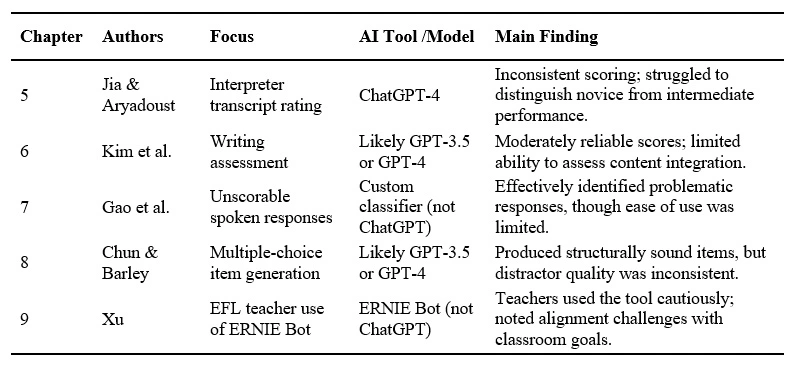 AI is entering language assessment, a high-stakes domain where scoring complexity and ethical concerns demand attention (Harding et al., 2015). In my own teaching and professional development work, I have seen the promise of generative AI tools, particularly in saving time on low-stakes feedback. At the same time, I have observed how easily these tools can be overtrusted. Chapters 5 through 9 highlight this ongoing tension across a range of assessment contexts, models, and findings. Table 1 summarizes key insights from these chapters, offering a comparative view of how AI is being tested, trusted, and critiqued in classroom-relevant settings.
