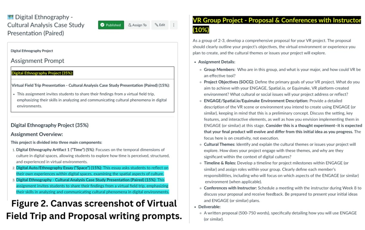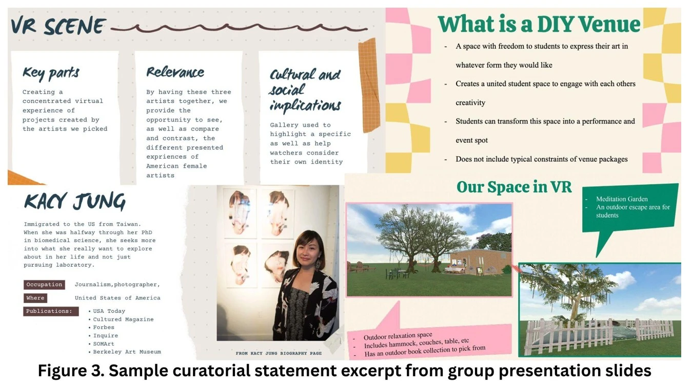 Next, students develop project proposals and curatorial statements of 500-750 words, articulating the rhetorical aims behind their virtual creations (see Figure 2). Each team outlines how spatial layout, visual motifs, and linguistic choices communicate cultural meaning and engage specific audiences. These assignments emphasize writing as an ethical process of representation, prompting students to consider how design conveys identity and belonging (see Figure 3).