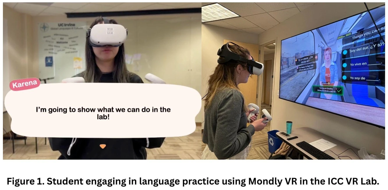 At UC Irvine, virtual reality (VR) supports two complementary approaches to multilingual writing instruction. Both emphasize writing as an act of design and interpretation rather than transcription, but they differ in how students encounter and produce language. In the Intercultural Communication and the VR Lab (ICC VR Lab), VR serves as input, or a catalyst for reflection that transforms embodied interaction into text. In contrast, the Global Cultures capstone course “Virtualizing Cultures” (GLBLCLT 191) positions VR as output, or a space where students compose, curate, and share stories through multimodal design.