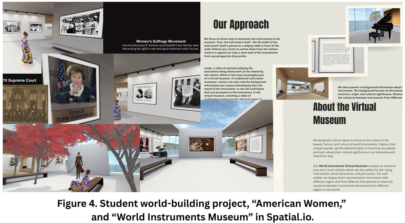 The sequence culminates in a multimodal composition that merges writing, affect, and space. Students collaborate to construct virtual exhibits that integrate multilingual captions, narrative voiceovers, and interactive elements. In one project, “American Women,” a team transformed a gallery into an archive celebrating multicultural female artists, embedding bilingual labels, ambient soundscapes, and guided narration (see Figure 4). Another group’s project, “World Instruments Museum,” invited visitors to move and listen through culture simultaneously, demonstrating how written meaning extends into design and embodied interaction. This kind of multimodal authorship reframes writing as both inquiry and expression. Through these activities, students learn that composing across languages and modes demands attentiveness to both audience and context—habits of mind that sustain effective writing across genres and media.