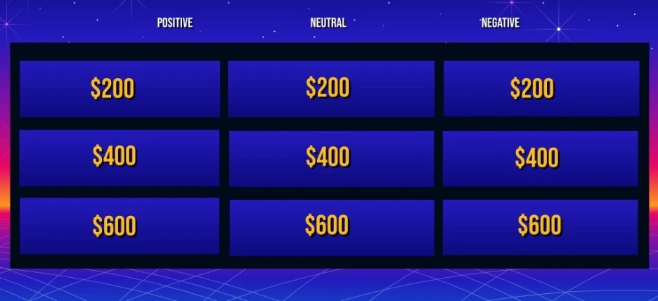 The game featured three categories of evaluative adjectives (positive, neutral, and negative) and three levels of difficulty indicated by labels: $200, $400, and $600 (see Figure 4). Groups took turns choosing a category and level (e.g., positive, $200) without repetition. Then, they were asked to create as many sentences as possible with the evaluative adjectives in the selected category and level.