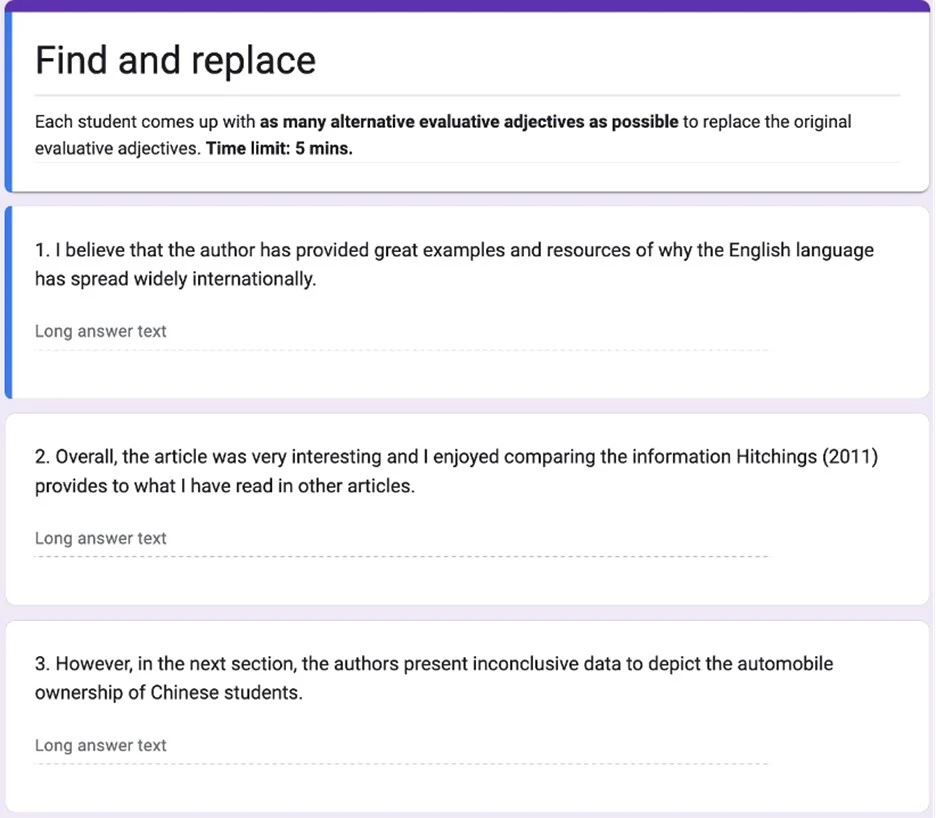 The first game focused on an individual competition called “Find and Replace” designed based on a list of evaluative sentence examples derived from Crow (see Figure 2). In this game, students worked individually to identify adjectives that express opinions in the provided sentences. Their task was to brainstorm as many alternative evaluative adjectives as possible within five minutes to replace the original ones. Then, the instructor evaluated grammatical and syntactical accuracy and awarded points for appropriate adjectives.