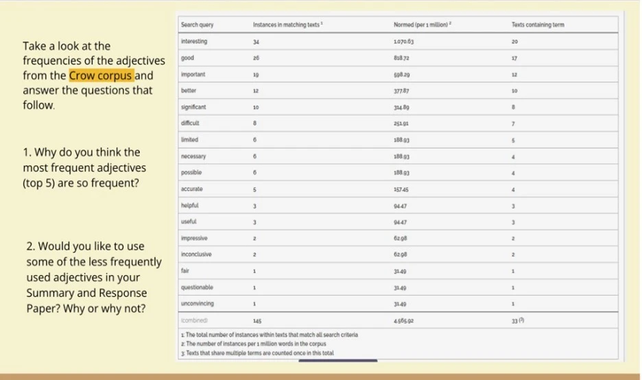 The class began with a word frequency list of evaluative adjectives derived from Crow (see Figure 1) and an introduction to the corpus. Students were guided to analyze the list and answer questions. This part aimed to enhance students’ understanding of the functions of evaluative adjectives and the benefits of using less common adjectives in their writing.