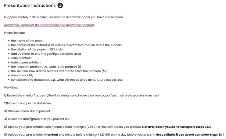 With the advent of AI-tools ranging from ChatGPT to Google’s Notebook LM, the task of reading and summarizing a ten-page scientific journal has gone from a number of hours to a few seconds. Thus, the process of understanding the IMRAD structure and how the authors pose the research question, describe the used methodology, present the results, and explain the significance of their results is greatly diminished if not entirely lost. AI-tools can bring about amazing increases in efficiency for scientists, professors, and those with experience to critically analyze the AI-generated results; for students and learners, however, the outcome may be ‘blind acceptance’ of the data the AI-tool generates, as they do not possess the necessary skills to critically question these results. As a lecturer, I did not want to grade summary papers while continually trying to walk the fine line of which AI-tools are allowed and to what extent can the AI-tool be applied. Thus, I dropped the written summary portion of the paper and replaced it with a research poster presentation in the form of a mock scientific conference poster walk in the 2025 Summer Semester.