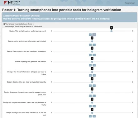 For this evaluation, I prompted Perplexity AI to create a survey to evaluate a research poster based on content, and design. Perplexity returned a survey with several questions which I then reduced to 16 total and adapted them into these four categories: basics (4), design (5), content (4) and visuals (3). A movable scale, a so-called slider, between 1 (lowest) to 5 (highest) was used to allow ease of use on mobile devices and so an overall rating for each poster could be calculated (Fig. 4). Additionally, I created a QR-code so that students could easily access the online survey on their mobile devices. Students evaluated 10 posters and I was quite impressed on how serious they performed this task both in the time taken for the evaluation which was approximately 6-7 minutes per poster and for the evaluation scores as well. Scores ranged from 55% to 91% with the average score of 81%.
