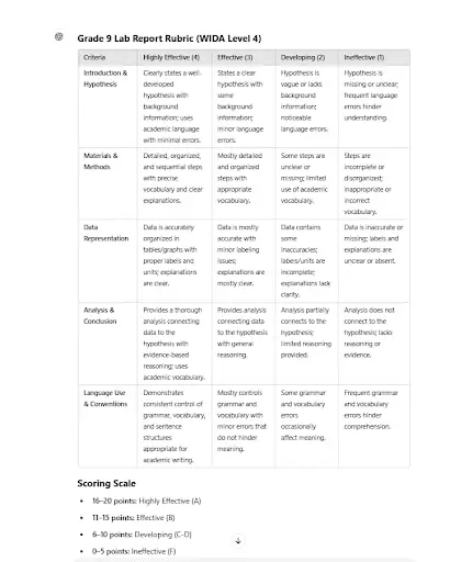 Step 1: Paste into the LLM: “You are a TESOL teacher. Using the following code, give an example to create a rubric for writing a lab report assignment for grade 9, WIDA level 4.”