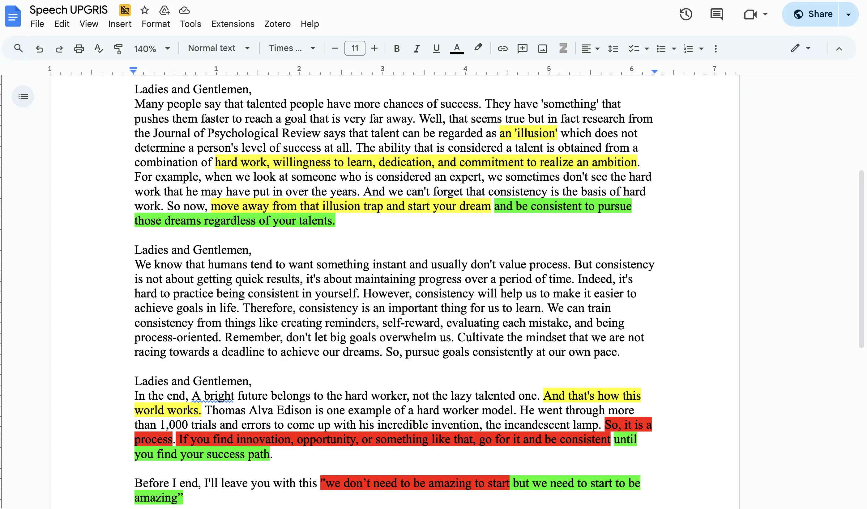 For students struggling with intonation, I occasionally apply a color-coding system to reinforce awareness. For example, I use red to indicate high intonation typically found in questions or emotionally charged statements, yellow to highlight important parts by spelling out the words one by one for emphasis, and green to signal low intonation, which is often associated with certainty or finality. The screenshot below is a sample of how I color-coded parts of the speech text to train students with intonation.