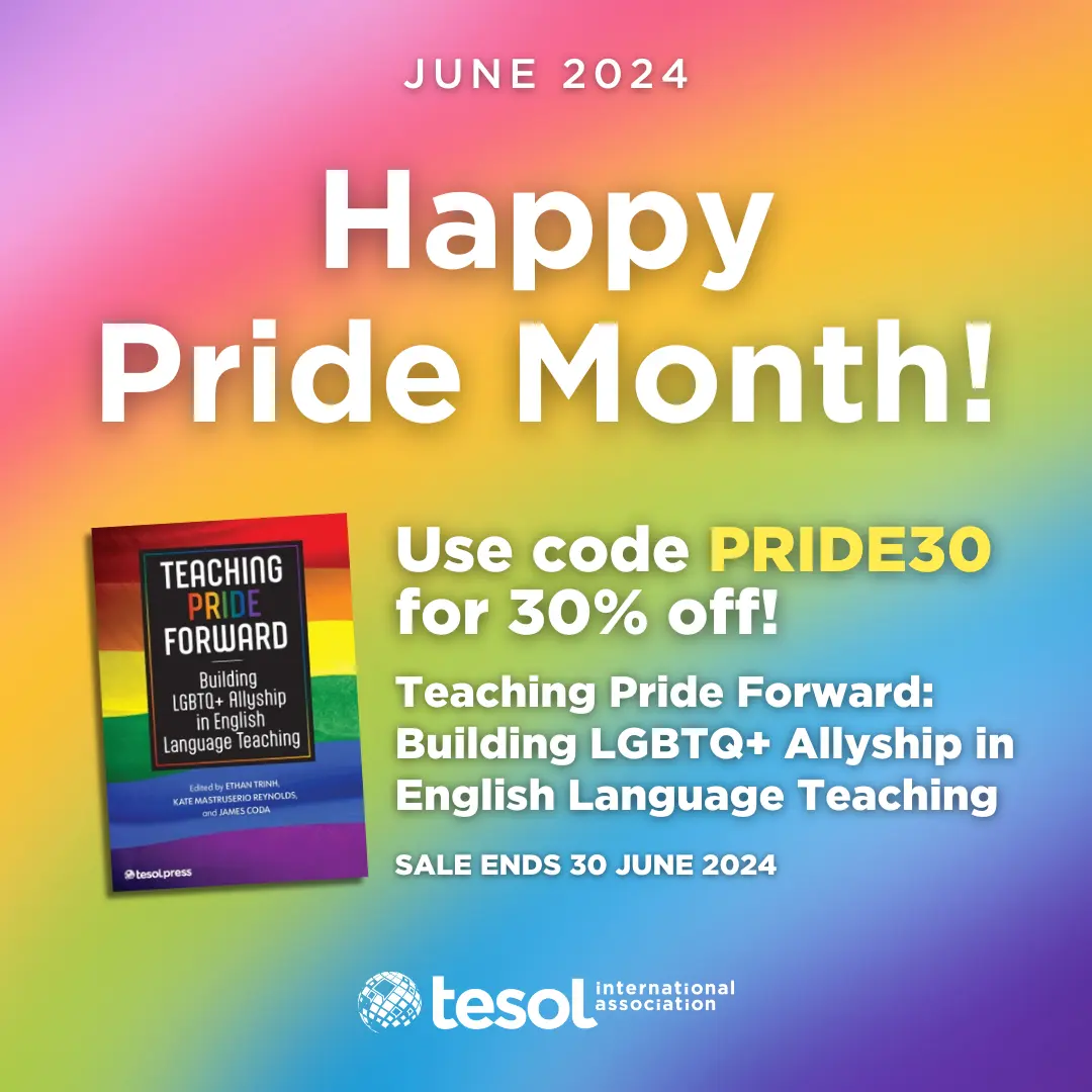 In honor of Pride Month, we're offering TESOL members 30% off of Teaching Pride Forward: Building LGBTQ+ Allyship in English Language Teaching! This title is for all educators who strive to be better allies to their colleagues, learners, and communities.